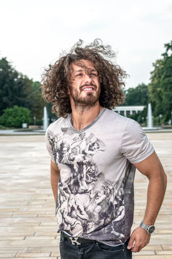 Mann in nischenartiger Öffnung vor verzierter Wand, trägt künstlerisches T-Shirt und sportliche Schuhe.